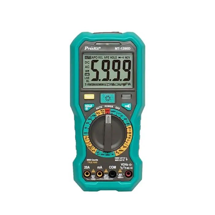 ProsKit MT-1280D 3 5/6 True-RMS Digital Multimeter True-RMS Digital Multimeter is designed for accurate measurements, ideal for a wide variety of electrical and electronic testing applications. Identify Live Wire with sound & light alarm Fuse Burnt Alarm, to protect your product & remind you to change a new fuse Auto Backlight, with inductive sensor, the backlight will light up automatically in dark areas
